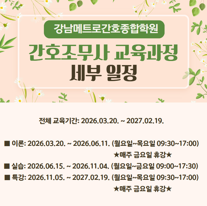 강남메트로간호종합학원에서 2026년 3월 20일에 개강하는 국비(국민내일배움카드 신청 및 소지) 주간반 일정을 공지해드립니다.